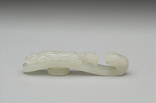 玉質,一組成對。鉤作龍首形,面琢立雕蟠螭,螭首上揚,身軀扭轉呈s形,動感十足,底有圓柱。
