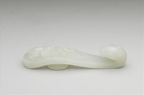 玉質,一組成對。鉤作馬首形,面雕小猴手持果樹枝,底有圓柱。