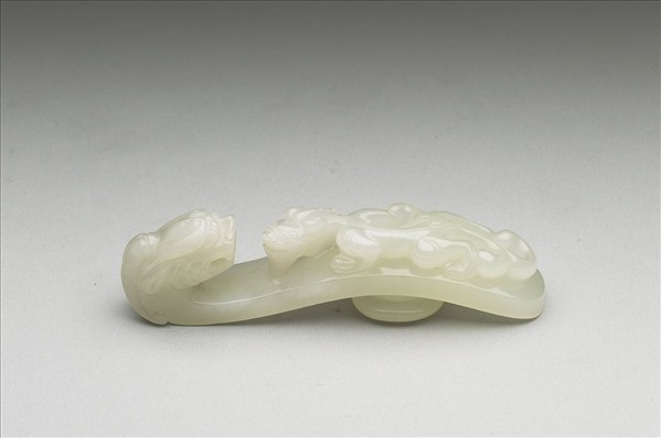 玉質。鉤作龍首形,面琢立雕蟠螭,螭首上揚,身軀扭轉呈s形,動感十足,底有圓柱。