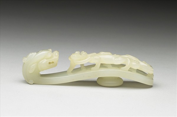 玉質。鉤作龍首形,面琢立雕蟠螭,螭首上揚,身軀扭轉呈s形,動感十足,底有圓柱。
