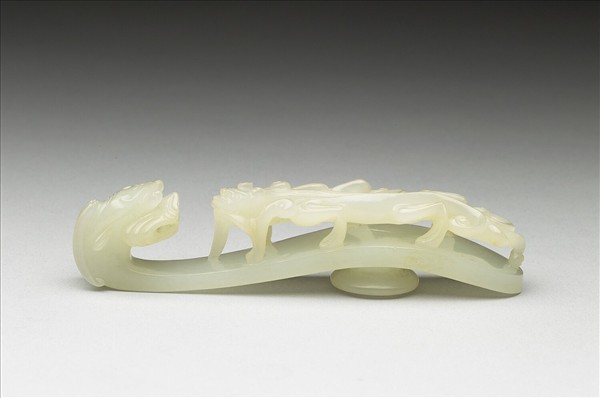 玉質。鉤作龍首形,面琢立雕蟠螭,螭首上揚,身軀扭轉呈s形,動感十足,底有圓柱。