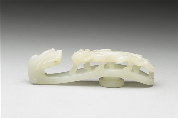 玉質。鉤作龍首形,面琢立雕蟠螭,螭首上揚,身軀扭轉呈s形,動感十足,底有圓柱。