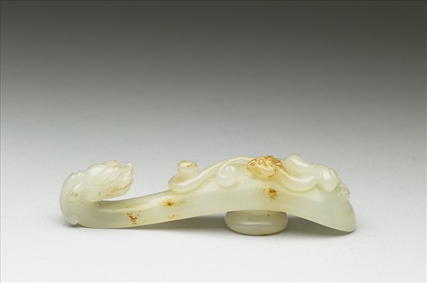 玉質,帶赭斑。鉤作龍首形,面琢浮雕回首蟠螭,身軀扭轉呈s形,動感十足,底有圓柱。
