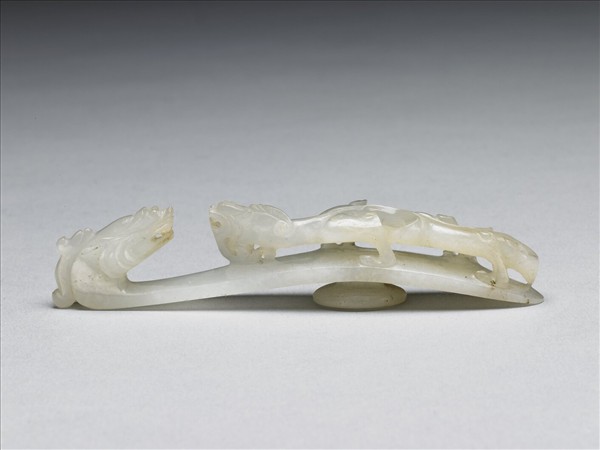 玉質,帶灰。鉤作龍首形,面琢立雕蟠螭,螭首上揚,身軀扭轉呈s形,動感十足,底有圓柱。