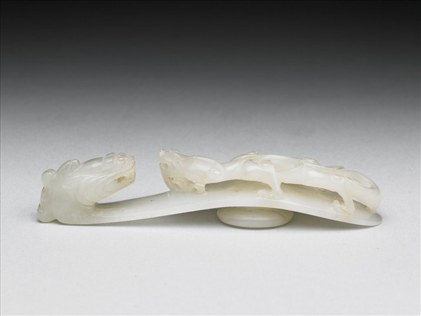 玉質。鉤作龍首形,面琢立雕蟠螭,螭首長而上揚,身軀扭轉呈s形,動感十足,底有圓柱。