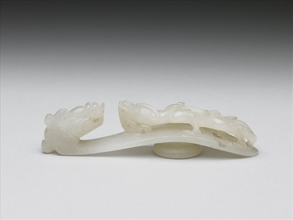 玉質。鉤作龍首形,面琢立雕蟠螭,螭首長而上揚,身軀扭轉呈s形,動感十足,底有圓柱。
