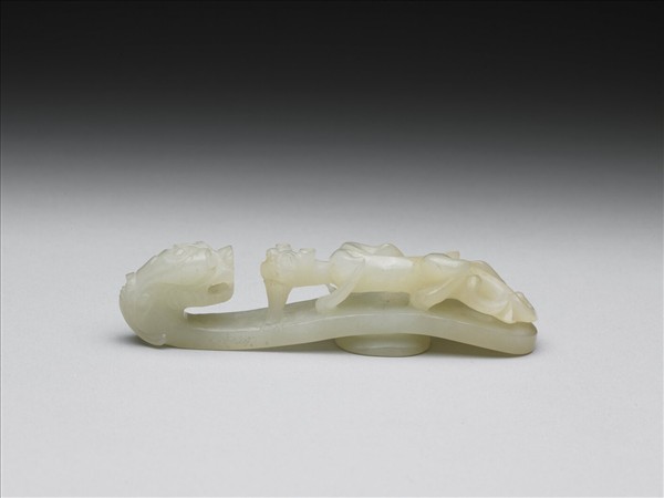 玉質。鉤作龍首形,面琢立雕蟠螭,螭首上揚,身軀扭轉呈s形,動感十足,底有圓柱。