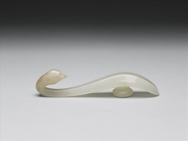 玉質,帶赭斑。鉤作鵝首形,面有兩道棱線,底有圓柱。