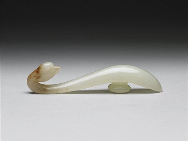 玉質,帶赭斑。鉤作鵝首形,面光素圓潤,底有圓柱。