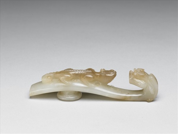 玉質,龍首微傷。鉤作龍首形,面琢浮雕蟠螭,底有圓柱。