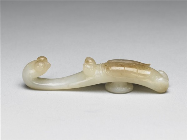 玉質,有赭斑。鉤作蟲首形,面琢蟬紋,蟲眼、蟬眼均圓突,底有圓柱。