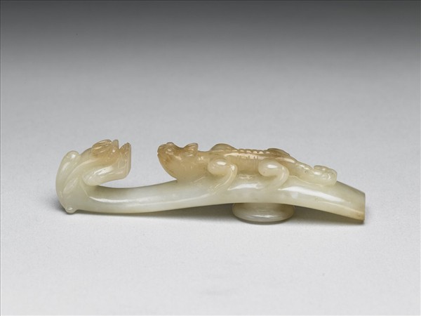 玉質,有黃赭斑。鉤作龍首形,面琢浮雕蟠螭,底有圓柱。