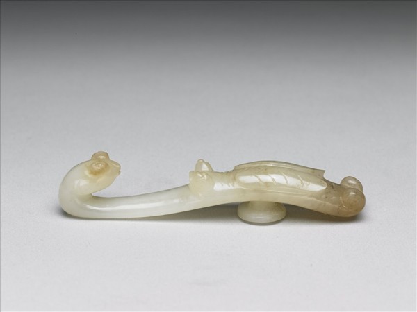 玉質,有赭斑。鉤作蟲首形,面琢蟬紋,蟲眼、蟬眼均圓突,底有圓柱。