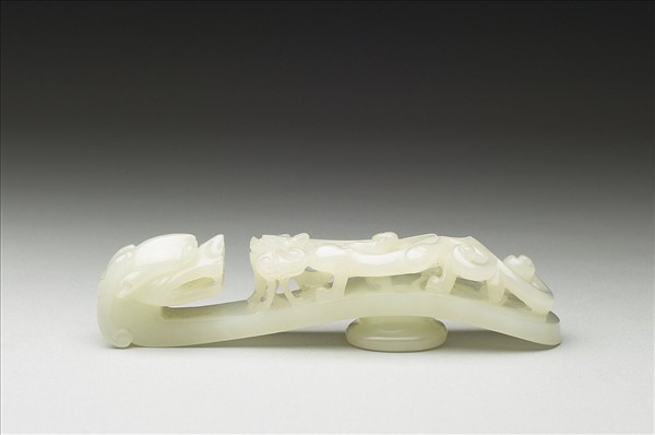 玉質。鉤作龍首形,面琢立雕蟠螭,螭首上揚長鬚,身軀扭轉呈s形,動感十足,底有圓柱。