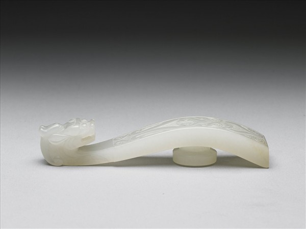 玉質。鉤作龍首形,面琢幾何紋,底有圓柱。