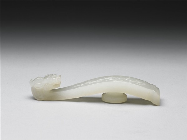 玉質。鉤為龍首形狀,背面有一突起的圓柱,作固定革帶,彎曲之鉤,則扣在另一端的環上。正面琢梅花,背面亦以陰線刻龍的鬃毛,十分細膩。