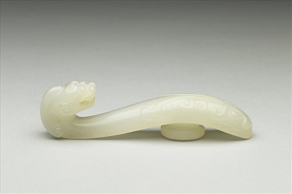 玉質。器身呈淺弧度,一端向上內捲,作龍首形狀,背面有一突起的圓柱,其作用是固定於革帶上,彎曲之鉤,則扣在另一端的環上。器面琢簡化獸面紋。
