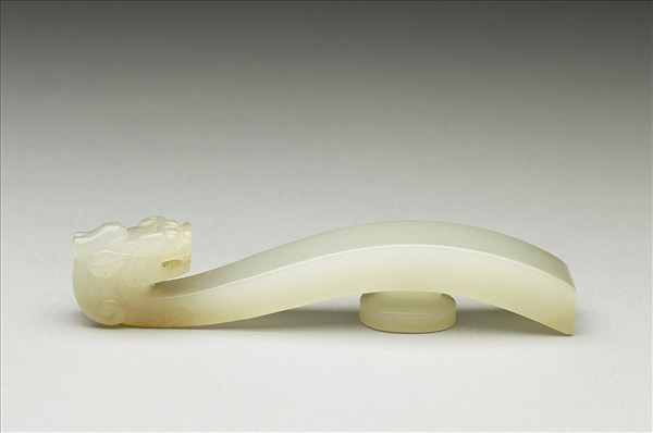 玉質。鉤作龍首形狀,背面有一突起圓鈕,作固定革帶用,彎曲鉤首,可扣於另一端的環上。器身光素無紋。