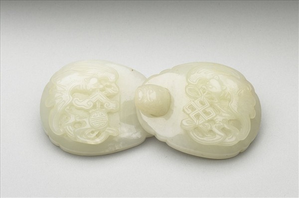 玉質,一作鉤,一作環,兩者背面皆有突起圓鈕,用來固定於革帶上,鉤環相扣,即可束繫腰帶。鉤上琢蝙蝠和團壽字,環上琢蝙蝠銜盤長,皆具「福壽綿長」吉祥寓意。