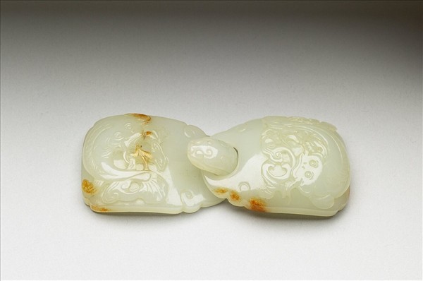 長方形玉,局部有赭色斑,一作鉤,一作環,兩者背面皆有突起圓鈕,用來固定於革帶上,鉤環相扣,即可束繫腰帶。彎曲之鉤作獸首;鉤環表面皆浮雕鯉魚和靈芝,寓意吉祥。