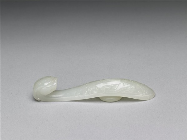 玉質。鉤作龍首狀,背面有一突起的圓鈕,固定革帶用。帶鉤面上裝飾幾何化蟬紋。