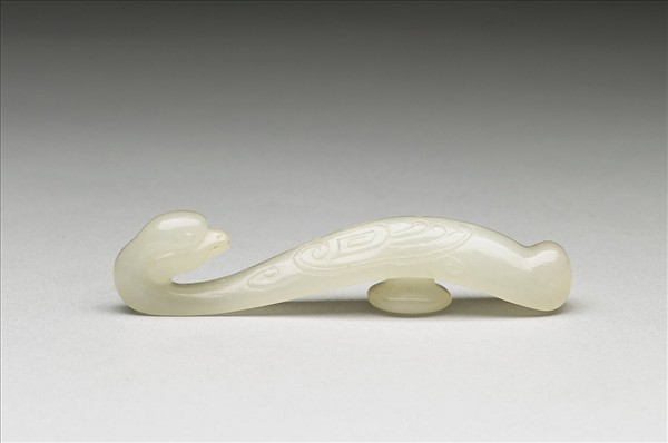 玉質,部分呈赭色。鉤作鵝首狀,背面有一突起圓鈕,固定革帶用。器面琢幾何紋飾,象徵鵝的羽翼。