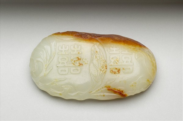 玉質,局部帶赭斑。不規則的橢圓形,面凸背凹,狀似貝殼。器面巧琢成雙桃帶,淺浮雕枝葉及蝙蝠,桃上並浮雕雙囍字;背面雕兩個突起的方圓柱形紐,紐上分別琢花瓣和獸首。帶板可固定革帶,作裝飾用。