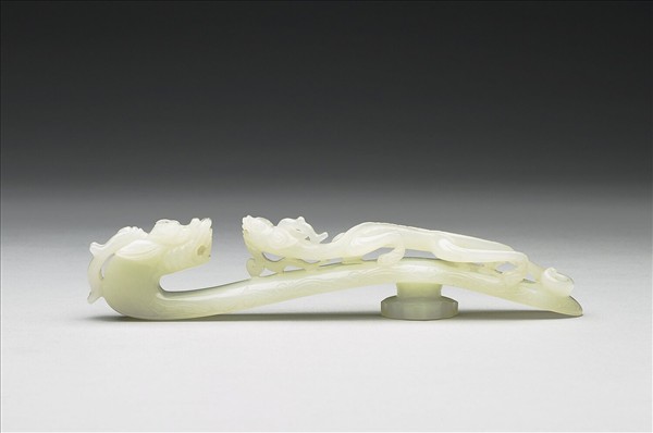 玉質。鉤作龍首形,背面有一花瓣式的柱狀鈕,作固定革帶用。器面浮雕螭龍一隻,一大一小兩龍相視而對。