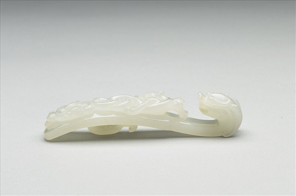 玉質,玉質瑩潤。鉤作龍首形,背有凸起方形環鈕,可穿繫革帶。器面浮雕二首尾交纏的螭龍紋。