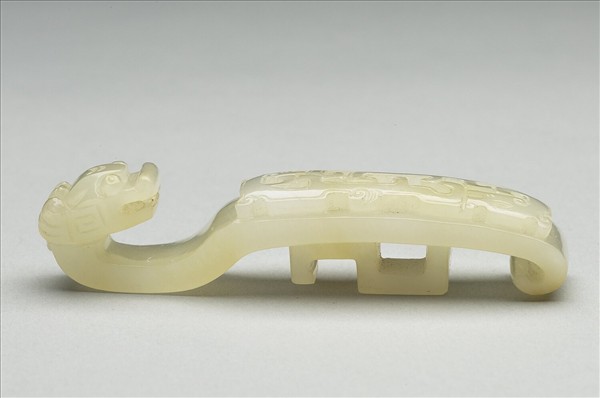 玉質,質瑩潤。鉤作龍首狀,背面雕方鉤兩個作環,革帶可以穿過或固定。器面雕兩隻首尾交纏的夔龍。