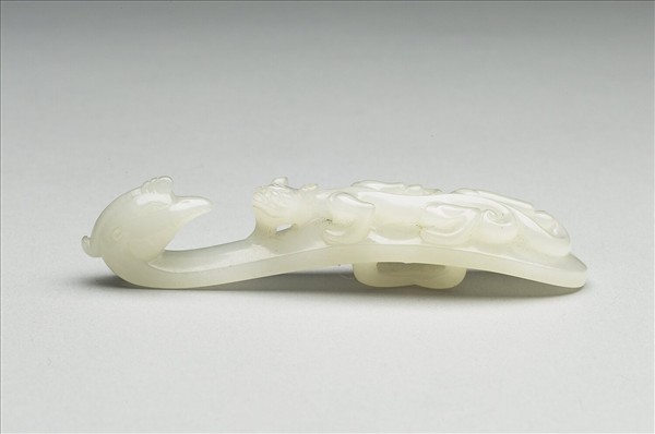 玉質。鉤作鳳首狀,背面的環作交叉橋式鈕,革帶可以穿過。器面浮雕螭龍一隻,與鳳相望。