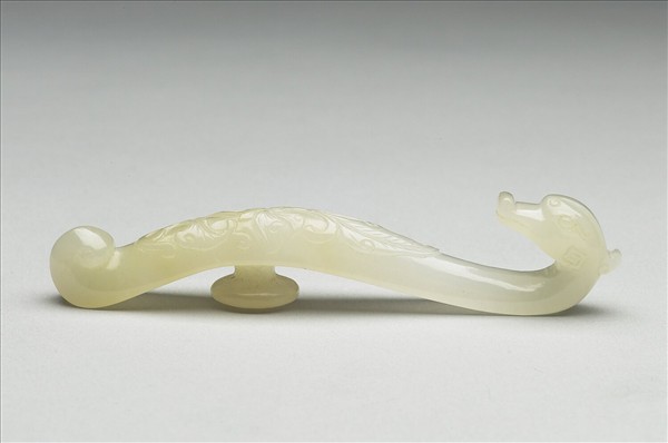 玉質。鉤作捲鼻獸首形,背面有一突起圓鈕,作固定革帶用。器面飾捲枝花葉紋。