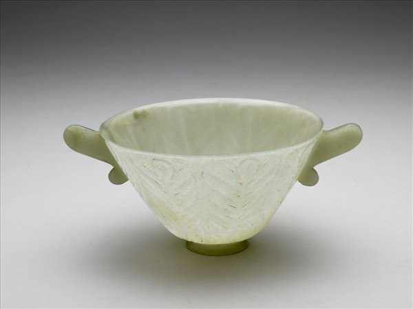 淺豆綠色玉,琢一薄壁深腹圓碗,小圈足、雙柄雕作人耳形。腹壁雕一排垂直的莨苕葉,但單片葉子的外輪廓顯得比較平順。