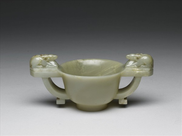 玉質,色青帶灰。侈口、深弧壁、圈足,雙耳上飾臥鹿。外底心琢「乾隆御用」四字隸款。與故玉2440玉盤為一組。