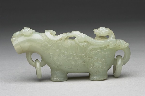 青玉質。全器雕四足獸形,獸背鏤一圓形注口,獸首作圓孔狀流嘴,嘴下設環鈕,尾部雕獸首銜環鈕。器表高浮雕雙螭攀附,器身琢花瓣、如意紋飾,後足刻獅面紋。
