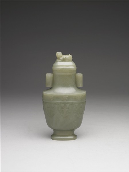 玉質,帶深綠色斑紋。侈口,短頸,頸兩旁有雙貫耳,寬肩,直腹斂下,帶高足。腹部紋飾分兩層,上層浮雕漩渦紋,下層浮雕蕉葉紋,蓋頂雕臥獸紐。附木座。