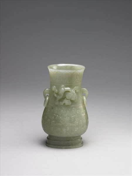 玉質。尊形,侈口,長頸,碩腹,雙耳,圈足。頸上部飾以蓮瓣紋,下部浮雕螭紋,腹琢獸面紋、隙地琢雲紋,雙耳雕象首,下接活環。底有「乾隆年製」篆款。