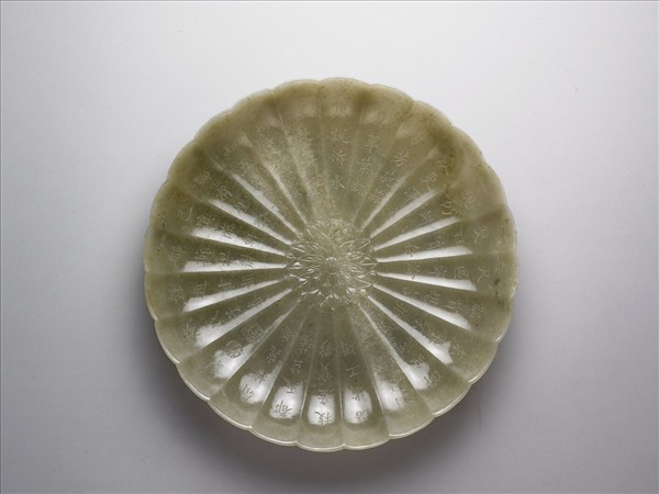 玉質,琢作一盛開的二十四瓣蓮花形大盤,盤心雕一平展的蓮花。底部雕作平展的三層八瓣花。圍以寬大的莨苕葉紋一周。與故玉2471為一對玉盤,於1768年被送進宮中,這是乾隆皇帝第一次認識來自印度的玉容器,乾隆皇帝為之賦詩,並將詩加刻在盤面。