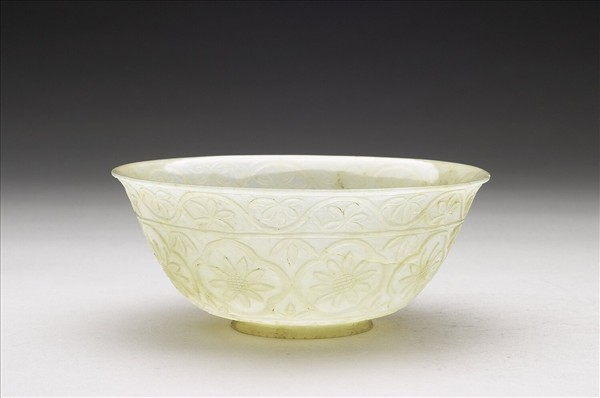 玉質,琢一薄壁圓碗。腹壁上緣雕一圈蔓連花,腹壁中段排列九個花式開窗,每個開窗內雕一平展的花朵。其餘器表裝飾三瓣與五瓣花。器底琢一平展花朵,外圈圍繞一圈密集的花瓣。每個葉片與花片都磨成橢圓的凹窩。