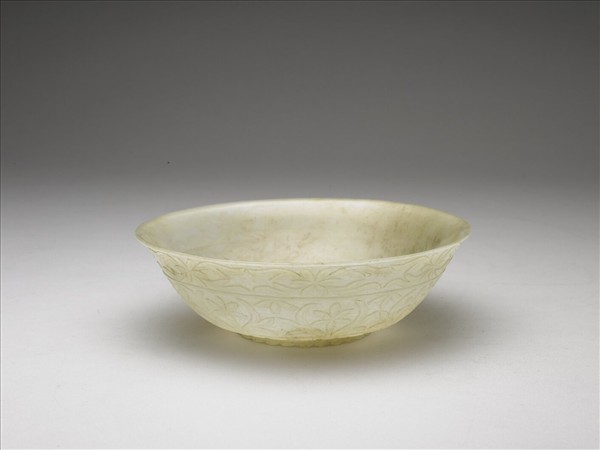 玉質,局部淺黃斑。琢一薄壁圓碗。腹壁分三條平行裝飾帶,雕不同的花葉紋。器底雕一平展花朵。每個葉片與花片都磨成橢圓的凹窩。