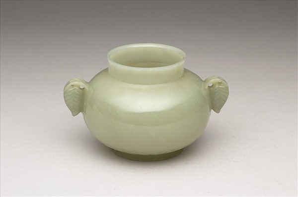 玉質,所雕琢的可能原本為蓋罐,目前蓋子已佚失。器表較為光素,僅在腹壁下緣琢莨苕葉紋一周。左右二側自下緣向上伸展莨苕葉至器肩,葉尖向外彎曲,再垂以花蕾。器底雕一平展的罌粟花,交叉覆疊四片輕柔的花瓣。