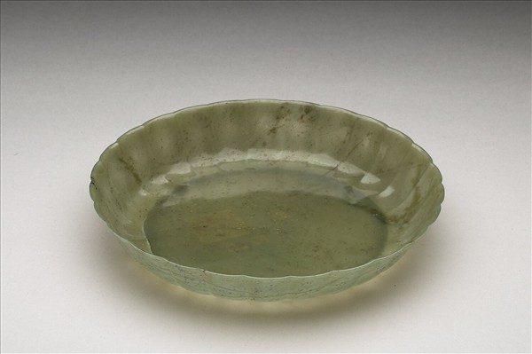 不勻的豆綠色玉,雕一圓盤,平底,腹壁雕作波浪般的花瓣,頗為薄透。
