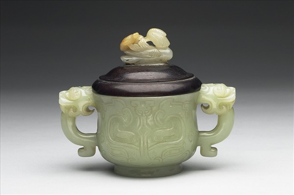 玉質。簋形,侈口、深腹、圈足、雙耳作獸形,附玉頂木蓋。腹琢獸面紋,玉頂為回首鴛鴦,口銜花枝。
