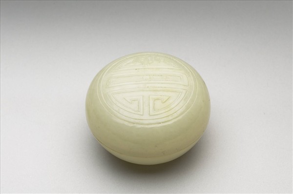 玉質。圓盒,子母口、淺腹、圈足。蓋面琢「壽」字,外以圈紋兩道界之。