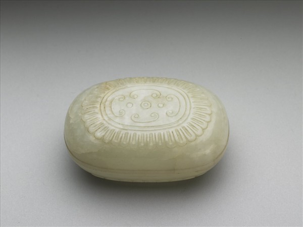 玉質。橢圓盒,蓋器對稱。淺腹、圈足。蓋面琢勾雲紋,外圍一圈花瓣,圈足飾蓮瓣紋。