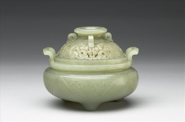 玉鬲式爐。口沿雙立耳外撇、鼓腹、三乳足,帶蓋,蓋上有三圓穿,蓋面鏤空飾纏枝蓮瓣紋,器腹三角垂帘交錯,內飾以變形獸面紋、回紋,口緣和蓋鈕飾回紋。
