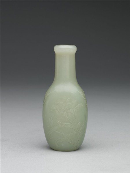 玉瓶。口緣出唇一圈,直頸、斜肩、鼓腹、平底。腹兩面分飾菊花、萱草紋,肩飾一對蝴蝶。