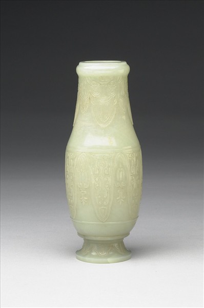 玉瓶。口下一道稜紋凸起,直頸、腹微鼓、圈足。腹飾波帶紋,內填幾何紋,頸、足均飾蕉葉紋。