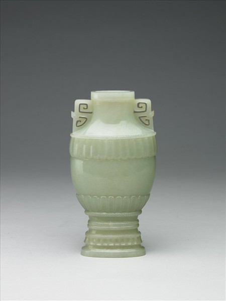 玉質。扁瓶,盤口、寬肩、斂腹、高圈足作三階式。雙耳作幾何式。肩、足均飾菊瓣紋,間以數道綯紋。