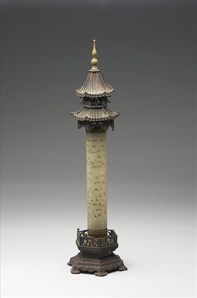 圓筒形,附木雕亭式蓋,雙層垂簷,銅頂;下托以木雕須彌座。香筒鏤空,鏤刻一對大小龍穿梭於雲朵間,上下各飾一圈雷紋。